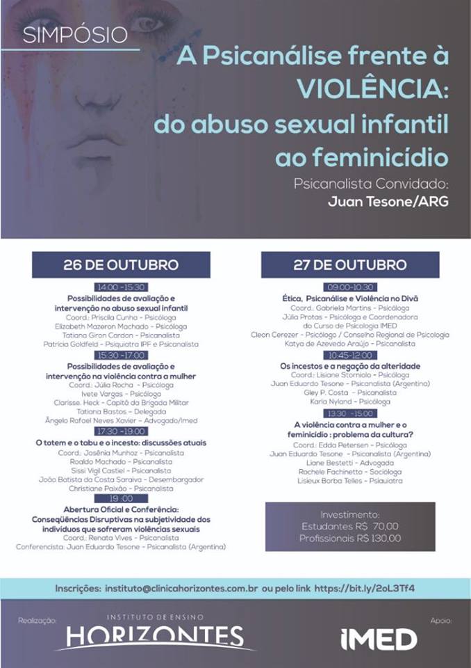 O Instituto dos Advogados do RS apóia o simpósio “A Psicanálise frente à Violência: do abuso sexual infantil ao femenicídio”, que acontecerá nos dias 26 e 27 de outubro, na Rua Dona Laura, 1020, no bairro Rio Branco. A diretora-adjunta do Grupo de Estudos de Direito de Família, Dra Liane Bestetti, participará do simpósio como palestrante.