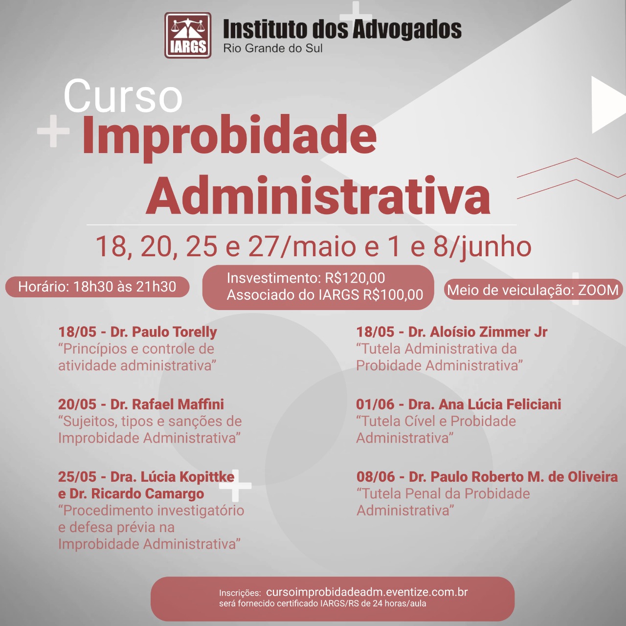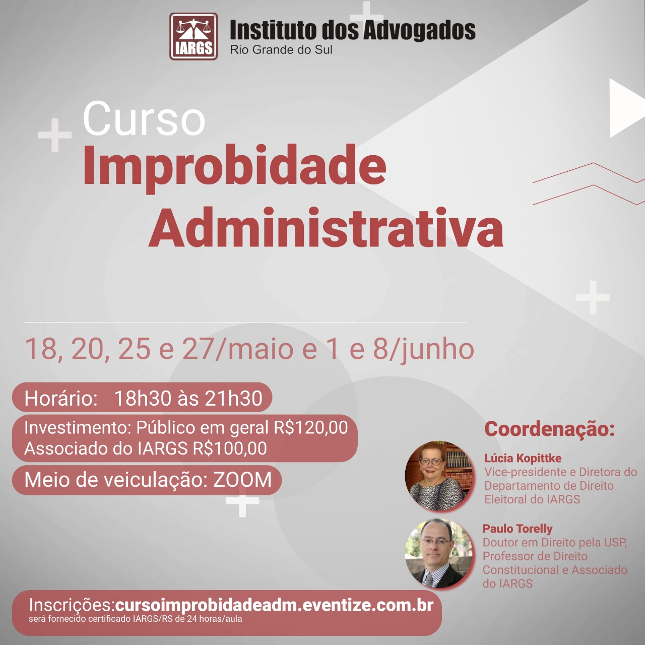 O IARGS promoverá o curso “Improbidade Administrativa”, na plataforma Zoom, em seis dias, entre maio e junho, sob a coordenação da vice-presidente do instituto, Lucia Kopittke; e do associado Paulo Torelly, professor de Direito Constitucional. Sete renomados professores ministrarão as aulas. O curso será realizado nos dias 18, 20, 25, 27 de maio e 1º e 8 de junho, sempre das 18h30 às 22h.