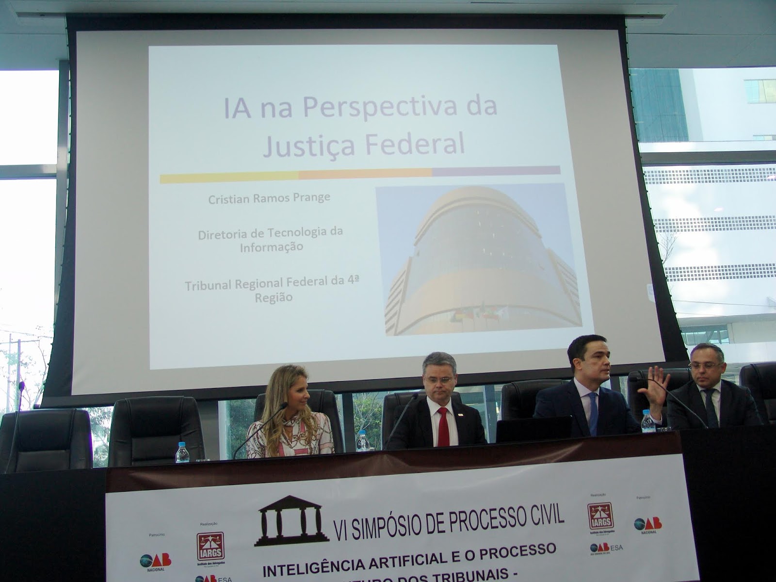 Após o intervalo, foi realizado o Painel 2 intitulado de “Inteligência Artificial e Tribunais”. O primeiro a palestrar foi o diretor de Tecnologia da Informação, Dr Cristian Ramos Prange, discorrendo sobre “Inteligência Artificial na perspectiva da Justiça Federal”. A preleção abordou o contexto tecnológico da Justiça Federal da 4ª Região, com a adoção do processo eletrônico, e a necessidade de ferramentas de análise textuais baseadas em Inteligência Artificial. Com isso, descreveu, de forma breve, as iniciativas e o planejamento do TRF4, em relação à IA, até 2020.