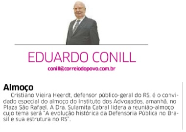 7-) Veículo: Coluna Eduardo Conill – Jornal Correio do Povo (Porto Alegre/RS) – Reunião-almoço com o Defensor Cristiano Vieira Heerdt
