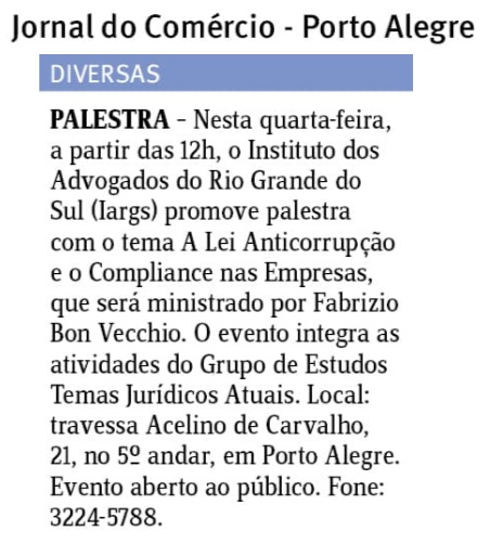 12-) Veículo: Coluna Diversas – Jornal do Comércio (Porto Alegre/RS) – Palestra Dr Fabrizio Bon Vecchio