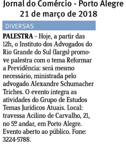 7-) Veículo: Coluna Diversas – Jornal do Comércio (RS) – Palestra Dr Alexandre Triches