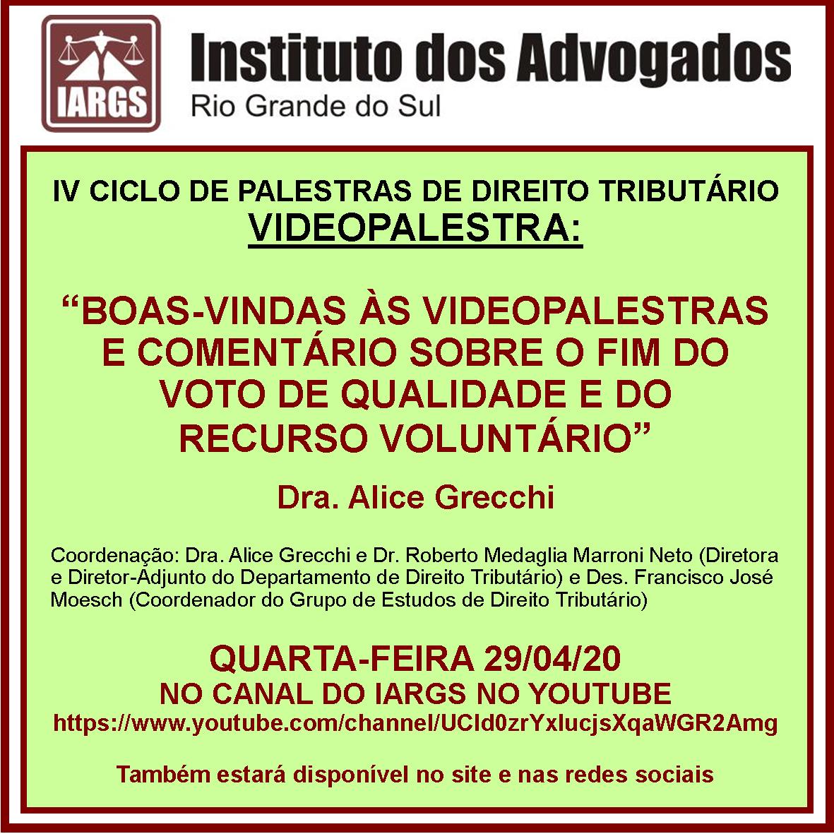 Está sendo inaugurada hoje, dia 29/04, a série de videopalestras do IV Ciclo de Palestras de Direito Tributário do Instituto dos Advogados do RS. A estreia foi feita pela Diretora do Departamento de Direito Tributário, Drª Alice Grecchi, vice-presidente do IARGS. Ela deu às boas-vindas ao novo formato on-line e falou sobre o tema “Fim do Voto de Qualidade e do Recurso Voluntário”.