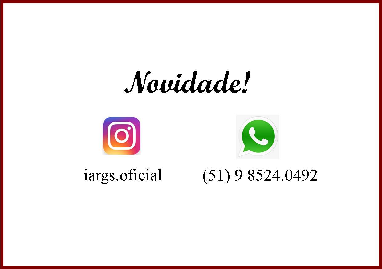 31/03/2018 13h21 - Atualizado 31/03/2018 13h21 Notícias IARGS com Instagram e WhatsApp Por Terezinha para IARGS O IARGS conta agora com Instagram e WhatsApp. Confiram e juntem-se a nós!