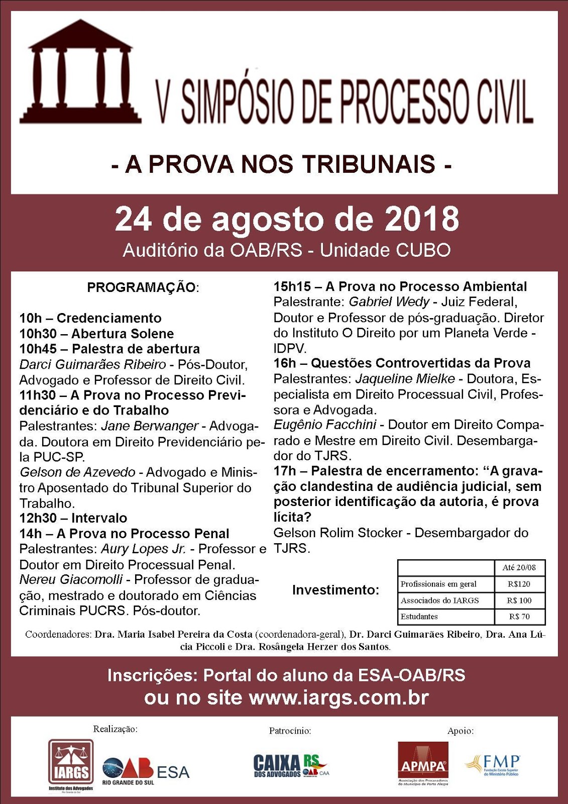 O V Simpósio de Processo Civil, promovido pelo IARGS (Instituto dos Advogados do RS) e pela ESA-OAB/RS, será realizado no próximo dia 24 de agosto, das 10h às 18h, no auditório da OAB/RS, unidade Cubo, em Porto Alegre (RS). O tema principal do evento será “A Prova nos Tribunais”.