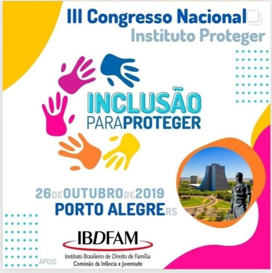 No próximo sábado, 26/10, o Instituto Proteger promoverá o III Congresso Nacional, e terá como tema “Inclusão Para Proteger”. O evento, que será realizado no no auditório da FADERGS, em Porto Alegre, conta com apoio da Comissão Nacional da Infância e Juventude do IBDFAM e do IARGS. O foco será desenvolver o tema da inclusão de crianças, adolescentes, jovens e idosos com deficiência.
