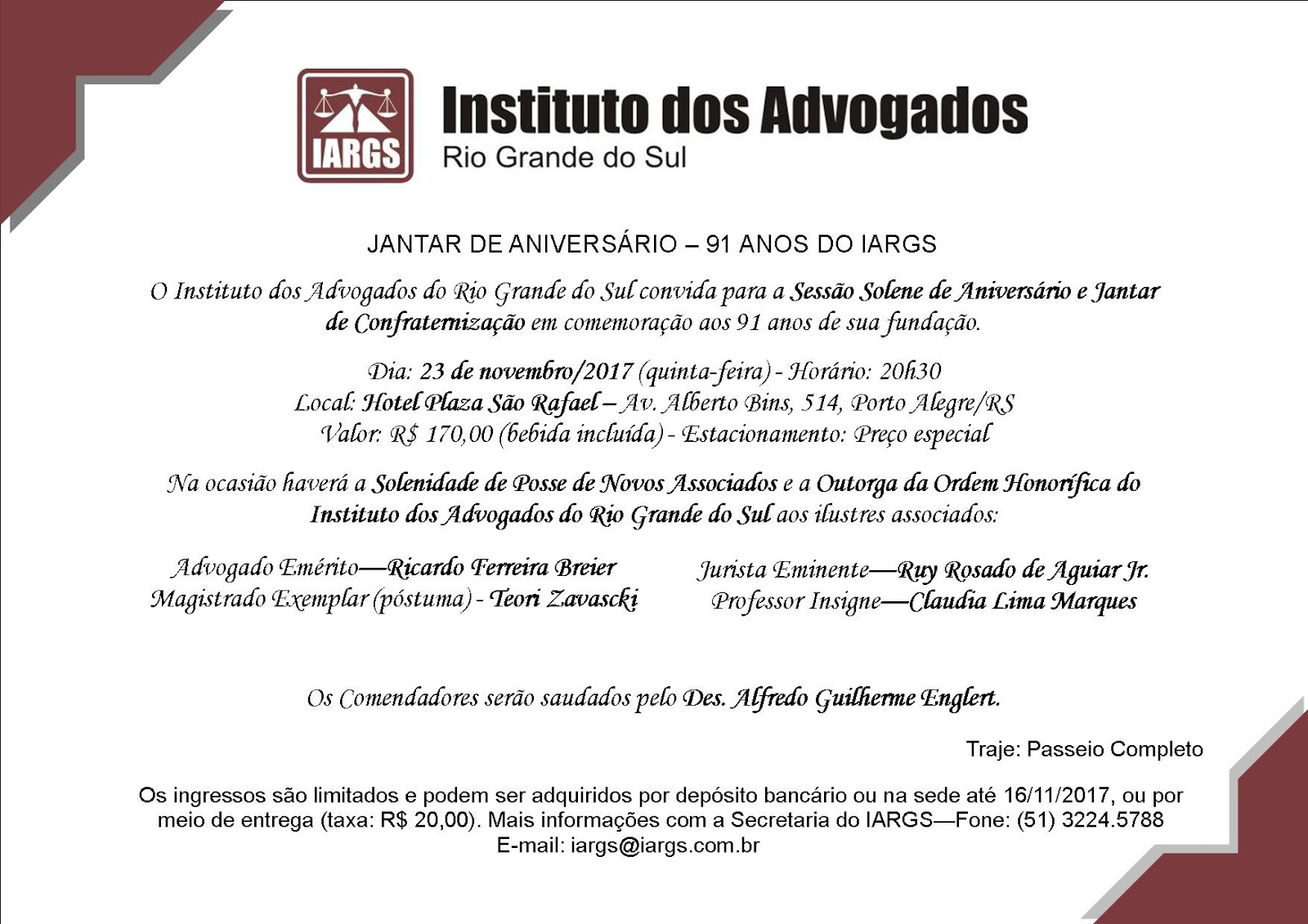 O Instituto dos Advogados do Rio Grande do Sul (IARGS) completa 91 anos de fundação neste ano e, para comemorar a data, está promovendo Jantar de Confraternização, no próximo dia 23 de novembro, quinta-feira, a partir das 20h30, no Hotel Plaza São Rafael. Na ocasião, haverá a solenidade de posse dos novos associados e a Outorga da Ordem Honorífica do instituto aos associados que prestaram sua contribuição à sociedade. Nesta edição serão homenageados os seguintes associados:
