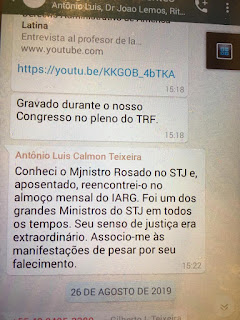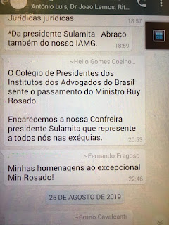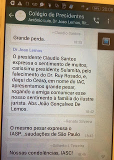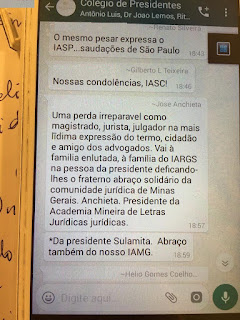 O IARGS, em nome de sua presidente, Dra. Sulamita Santos Cabral, recebeu manifestações de pesar de vários presidentes dos Institutos de Advogados de todo o Brasil pelo falecimento do Ministro Ruy Rosado de Aguiar Júnior, ocorrido no dia 24 de agosto. Entre eles, o presidente do Instituto dos Advogados do Distrito Federal,, Ministro Claudio Santos; o presidente do Instituto dos Advogados do Ceará, Dr. João Gonçalves de Lemos; o presidente do Instituto dos Advogados de São Paulo, Dr. Renato Silveira; o ex-presidente do Instituto dos Advogados de Minas Gerais, Dr. José Anchieta, também presidente da Academia Mineira de Letras Jurídicas; o presidente do Colégio de Presidente do Instituto dos Advogados do Brasil, Dr. Hélio Gomes Coelho; o ex-presidente do Instituto dos Advogados Brasileiros, Dr. Fernando Fragoso; ex-presidente do Colégio de Presidentes; e o ex-presidente do Instituto dos Advogados da Bahia e ex-presidente do Colégio de Presidentes dos Institutos de Advogados do Brasil, Dr Antônio Luís Calmon Teixeira.
