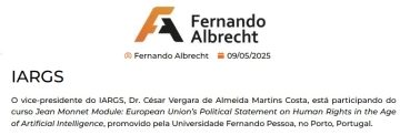 1-) Veículo: Colunista Fernando Albrecht (Participação vice-presidente em evento em Porto/Portugal) Publicado em 09/05/2025 Link: https://fernandoalbrecht.com.br/o-papa-americano/ 2-) Veículo: Colunista Fernando Albrecht (Palestra psicóloga Gabryellen Fraga)