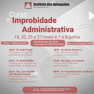 O IARGS promoverá o curso “Improbidade Administrativa”, na plataforma Zoom, em seis dias, entre maio e junho, sob a coordenação da vice-presidente do instituto, Lucia