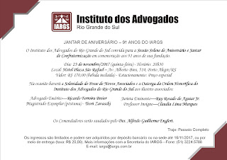 O Instituto dos Advogados do Rio Grande do Sul (IARGS) completa 91 anos de fundação neste ano e, para comemorar a data, está promovendo Jantar