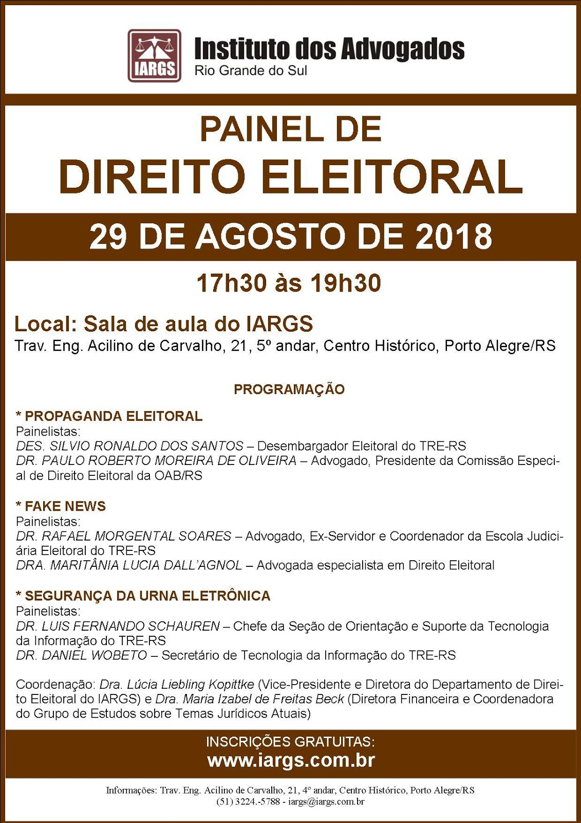 Com a proximidade das eleições majoritárias e proporcionais, o Instituto dos Advogados do RS realizará nesta quarta-feira, dia 29 de agosto, um Painel de Direito Eleitoral, das 17h30 às 19h30, no quinto andar do instituto. O objetivo do encontro, que é gratuito, é colaborar na elucidação da sociedade nas questões mais importantes sobre o próximo pleito, que será dividido em três temas: propaganda eleitoral, Fake News e segurança da urna eletrônica. A coordenação do painel está sendo feita pelas diretoras do IARGS, Dra Lucia Kopitke (vice-presidente) e Dra Maria Izabel de Freitas Beck, coordenadora do Grupo de Estudos Temas Jurídicos Atuais.