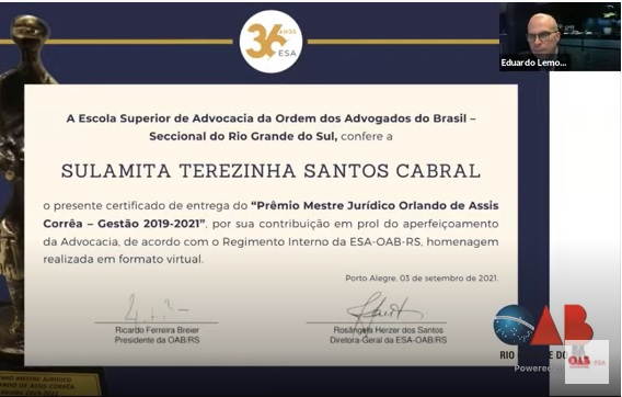Em comemoração aos 36 anos da Escola Superior de Advocacia da OAB/RS, a mais antiga do Brasil, foi realizada uma cerimônia virtual transmitida pelo Canal do Youtube da ESA (https://youtu.be/nI7DVLptEdU), hoje, dia 3 de setembro. Na oportunidade, houve a cerimônia de entrega do Prêmio Mestre Jurídico “Orlando de Assis Corrêa” e o lançamento do livro de memórias da ESA.