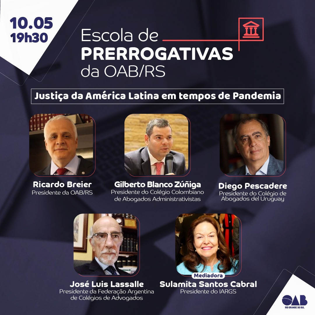 A presidente do Instituto dos Advogados do Rio Grande do Sul, Sulamita Santos Cabral, participará como mediadora do Webinar “Justiça da América Latina em tempos de Pandemia”, promovido pela OAB/RS, que acontecerá no próximo dia 10 de maio, a partir das 19h30, via plataforma Zoom com transmissão pelo Canal do Youtube da OAB local. A abertura do evento, que será feita pelo presidente da OAB, Ricardo Breier, tem por objetivo reunir diferentes visões e discutir os impactos da pandemia para a Advocacia da América Latina, na busca de melhores caminhos para atravessar o atual momento de crise.