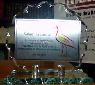 O publicitário João Firme de Oliveira, presidente do Instituto Ver Hesíodo Andrade, secretário-geral da ALAP (Associação Latino-Americana de Publicidade) entregou pessoalmente o Troféu Quero-Quero do Bem para a presidente do IARGS, Sulamita Santos Cabral, hoje, dia 16/07, na sede do instituto. A premiação é destinada a profissionais que se destacaram no ramo da Comunicação.