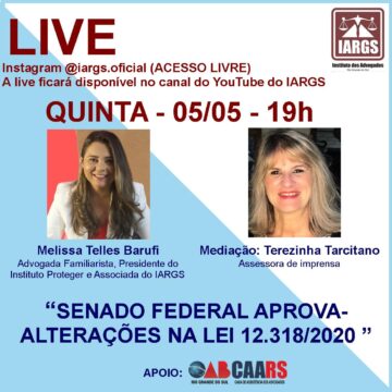 PRÓXIMAS LIVES Live com a Drª Melissa Telles Barufi- Senado Federal aprova alterações na Lei 12.318/2020
