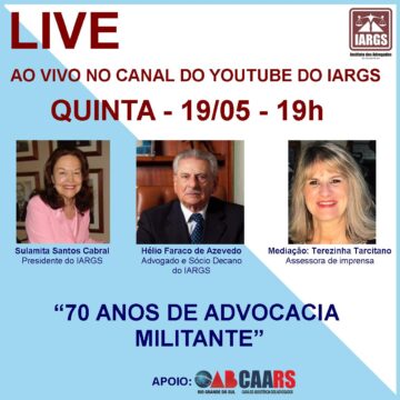 PRÓXIMAS LIVES Live com o Decano do IARGS, Dr Hélio Faraco de Azevedo- 70 anos de Advocacia Militante
