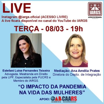 PRÓXIMAS LIVES Live com a Dra Estefani Luise Fernandes Teixeira- O impacto da pandemia na vida das mulheres