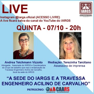 PRÓXIMAS LIVES Live com a Drª Andrea Vizzotto- A sede do IARGS e a Travessa Engenheiro Acilino de Carvalho