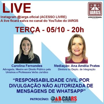 PRÓXIMAS LIVES Live com a Dra Carolina Fernandes- Responsabilidade Civil por divulgação não autorizada de mensagens de WhatsApp