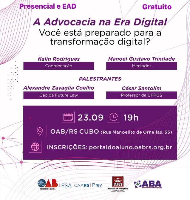 Com a coordenação da associada do IARGS e conselheira seccional da OAB/RS, a advogada Kalin Cogo Rodrigues OAB/RS será realizado o simpósio “A Advocacia na Era Digital – Você está preparado para a transformação digital?”, no dia 23 de setembro, a partir das 19h, no OAB/RS Cubo, em Porto Alegre (RS). O evento conta com o apoio do IARGS.