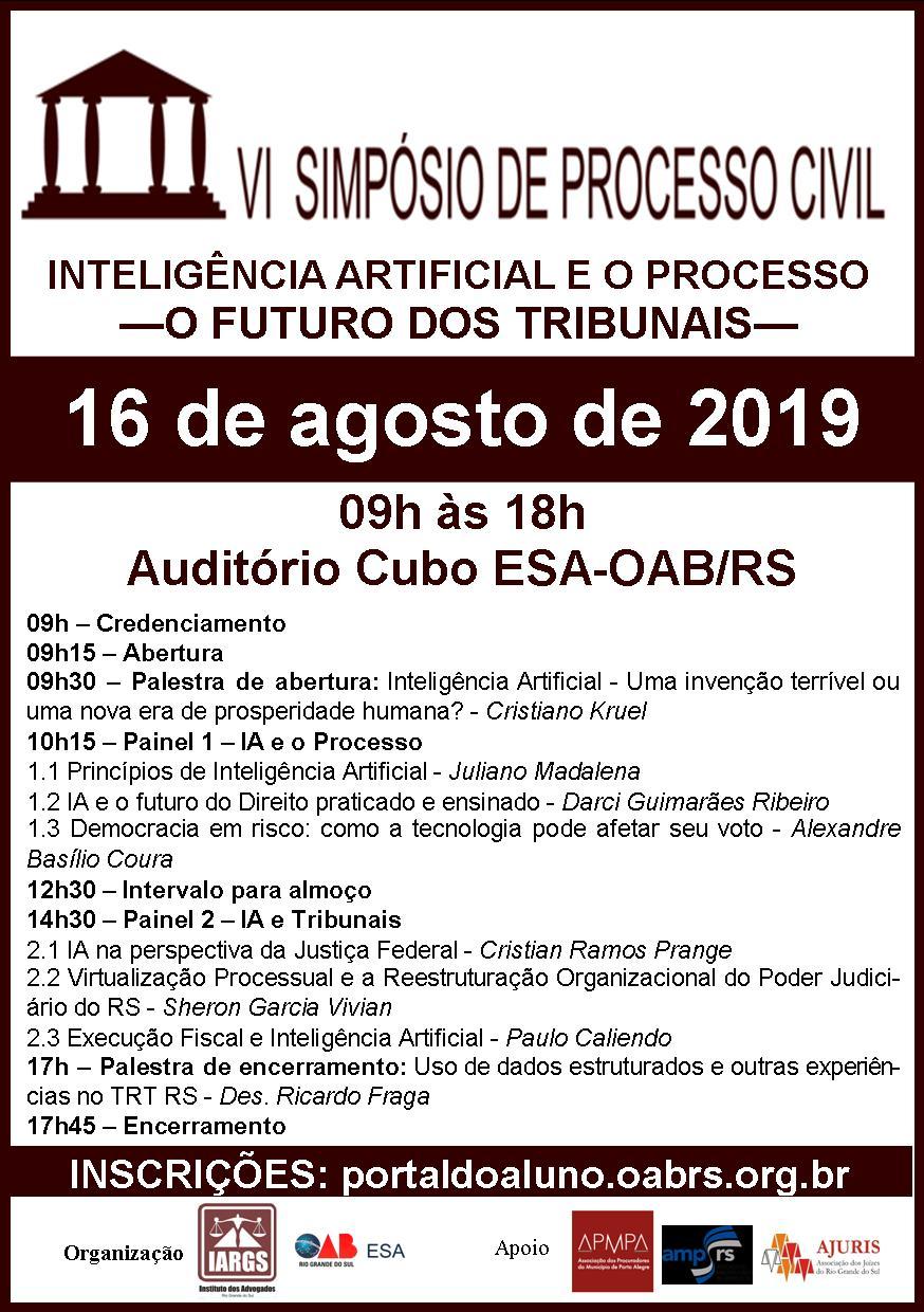 O Instituto dos Advogados do RS (IARGS), em parceria com a ESA/RS (Escola Superior de Advocacia), está promovendo o VI Simpósio de Processo Civil, que terá como tema principal “Inteligência Artificial e o Processo: o Futuro dos Tribunais”, no próximo dia 16 de agosto, das 9h às 18h, no auditório da OAB Cubo/RS. Ao todo, haverá a participação de oito palestrantes divididos em dois painéis, além das preleções de abertura e de encerramento.