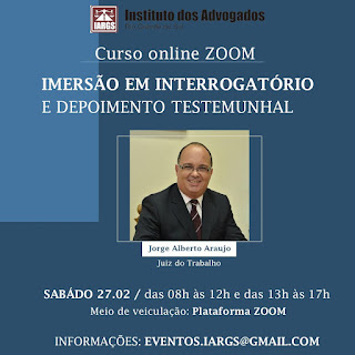 Imersão em Interrogatório e Depoimento Testemunhal é o nome do curso on-line que o Juiz do Trabalho e associado do IARGS, Dr Jorge Alberto Araujo, ministrará no próximo dia 27 de fevereiro, das 8h às 17h, com a promoção do IARGS. A transmissão será feita pela plataforma Zoom.